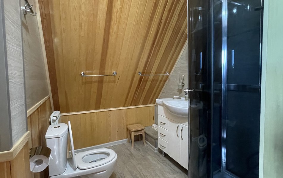 Санузел: душевая кабина, раковина, унитаз, туалетные принадлежности, фен